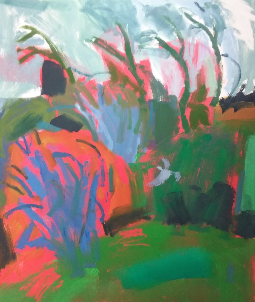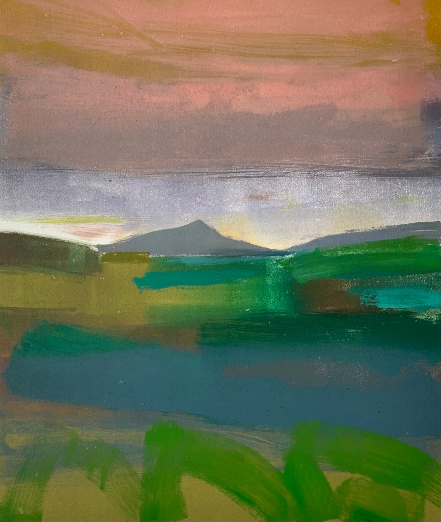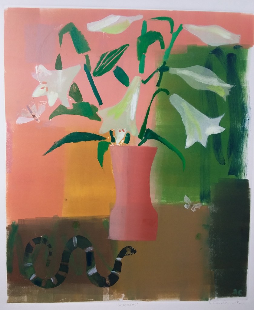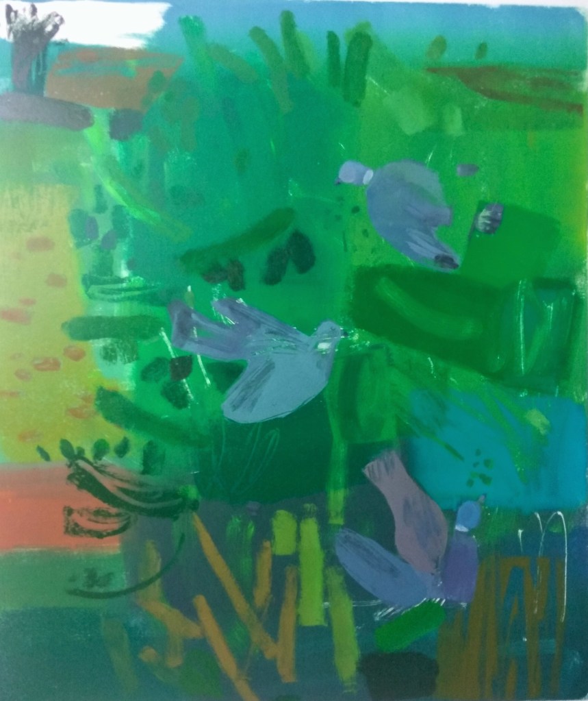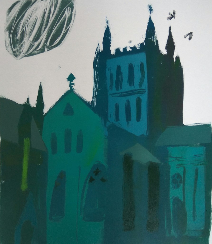 Monoprinting is my current obsession. I love drawing with rollers and ink and overlaying one colour on top of another. Several layers of printing are involved to develop an image. I apply ink to the surface of a plate using brushes or roller and draw into it with tools or a rag. I revel in the painterly quality of this process, capturing the energy of the mark making and creating a depth of colour.